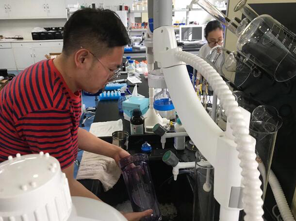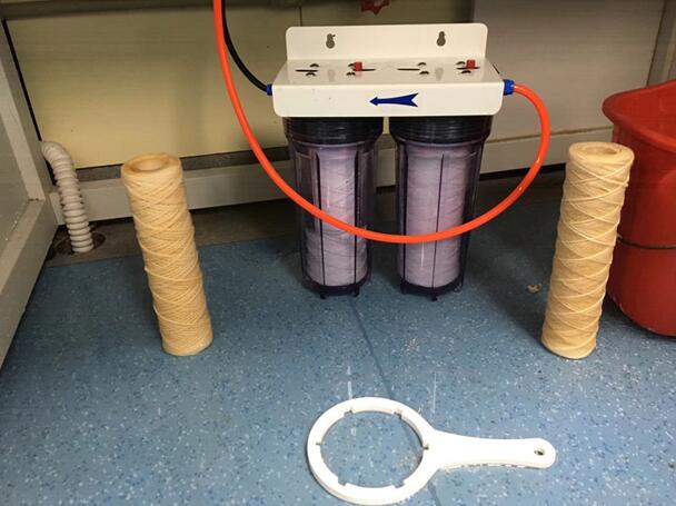 現(xiàn)場發(fā)揮穩(wěn)定的第三步:關(guān)閉自來水龍頭,抄起八角塑料扳手就開始擰前端預(yù)處理組件,先逆時針方向扭動(激動的心情應(yīng)搭配一瓶紅牛),發(fā)現(xiàn)我一個人搞不定的時候,王博士二話不說就過來幫忙,齊心協(xié)力一次完成(非常感謝他)。有了順利的開始,接下來的Progard預(yù)純化柱、Quantum 精純化柱、水箱空氣過濾器也都順利完成更換。