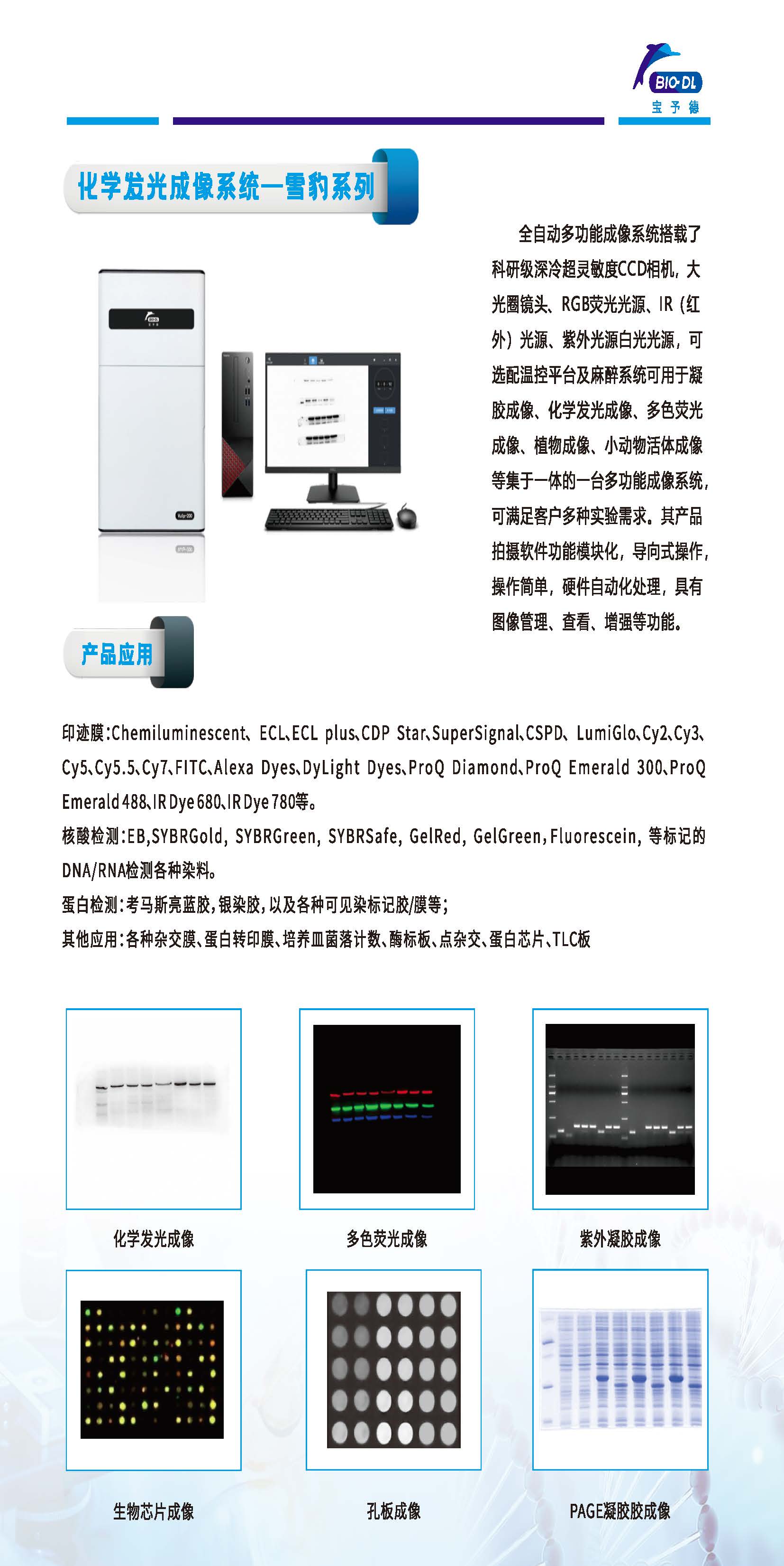 全自動多功能成像系統(tǒng)搭載了科研級深冷超靈敏度CCD相機,大光圈鏡頭、RGB熒光光源、IR (紅外) 光源、紫外光源白光光源,可選配溫控平臺及麻醉系統(tǒng)可用于凝膠成像、化學(xué)發(fā)光成像、多色熒光成像、植物成像、小動物活體成像等集于一體的一臺多功能成像系統(tǒng)可滿足客戶多種實驗需求。其產(chǎn)品拍攝軟件功能模塊化,導(dǎo)向式操作操作簡單,硬件自動化處理,具有圖像管理、查看、增強等功能。
